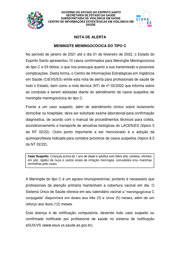 NOTA DE ALERTA MENINGITE MENINGOCÓCICA DO TIPO C